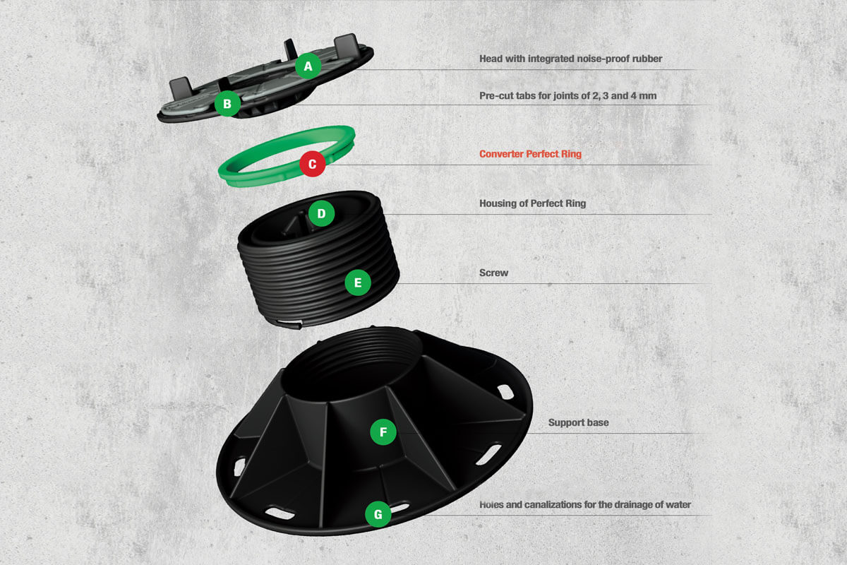 If you are unsure whether you want your raised floors to be fixed or self-levelled, we have the ideal solution for you: adjustable supports that use patented technology. Use this product to go between fixed or self-levelling heads for your raised floors in an instant while installing your floors! The Perfect Ring converter helps you assemble the product in a few seconds and allows for this adjustment flexibility. So if you prefer to create a fixed support, simply insert it between the head and the screw. Otherwise, if you prefer a self-levelling support where you need to adjust the slope of a surface up to 6%, there is no need to insert the ring. This makes for a quick and easy installation of raised floors whether they are for your terraces, pool sides, garden walkways or just general urban spaces.